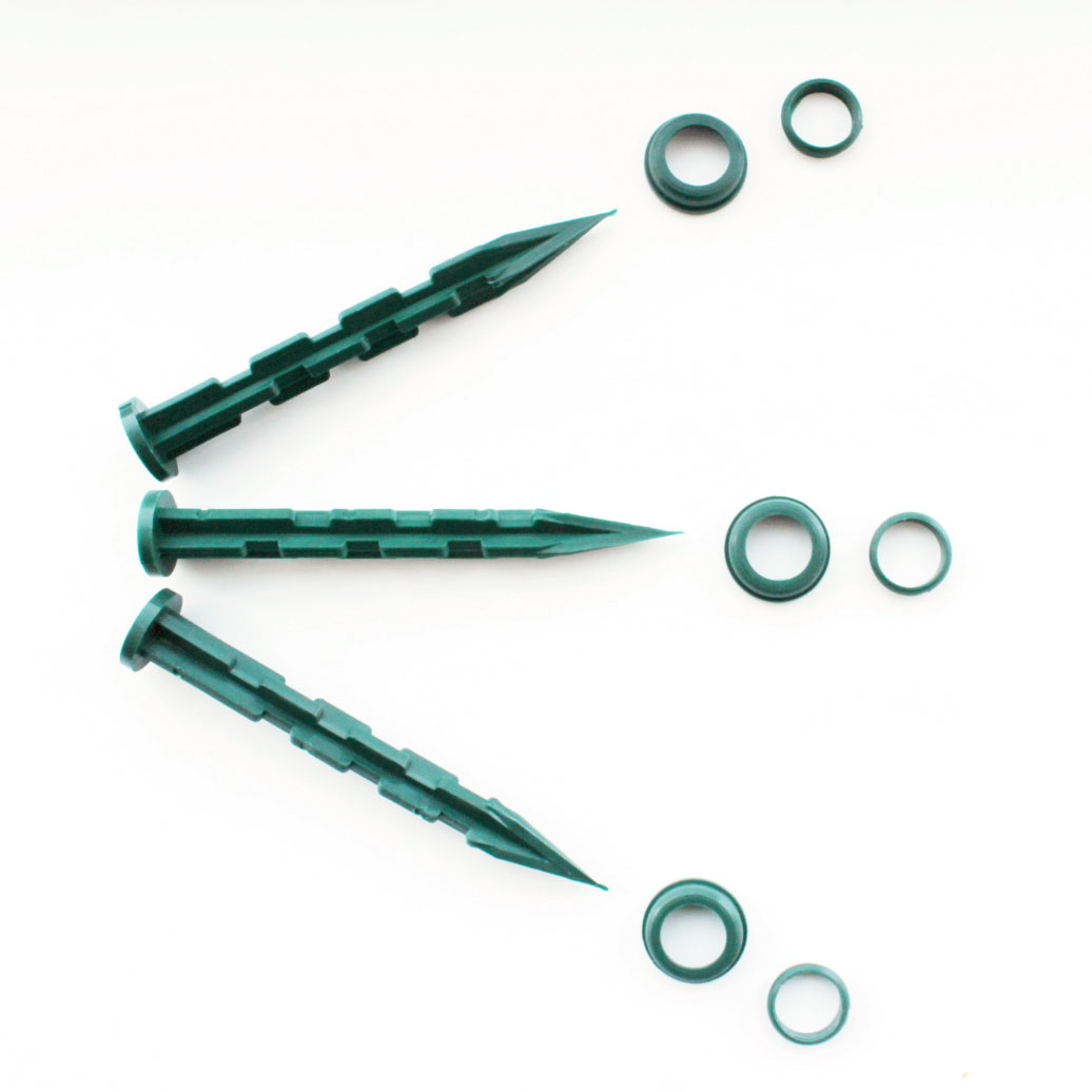 Колышки гораздо практичнее традиционных деревянных, пользоваться ими очень удобно, а крепёжная шайба не позволяет разрываться укрывной ткани в месте пробития и надёжно удерживает укрывной материал.